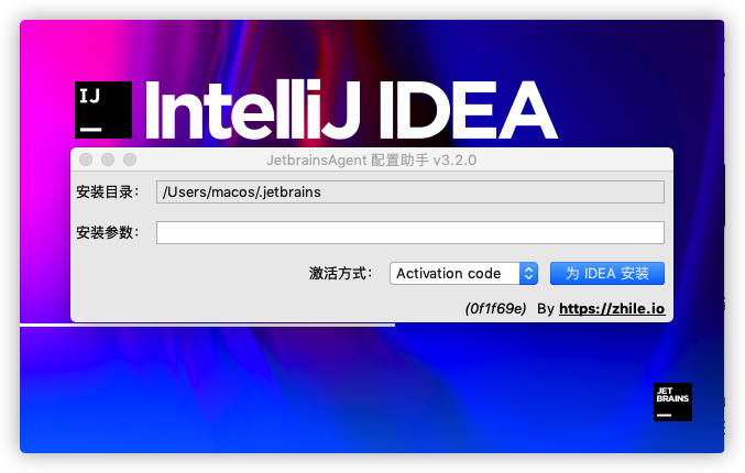- 重新启动后出现「JetbrainsAgent 配置助手」窗口,在安装参数处复制粘贴下面的安装参数,然后点击为 IDEAIntelliJ IDEA 安装,最后点击 是,会重新启动。