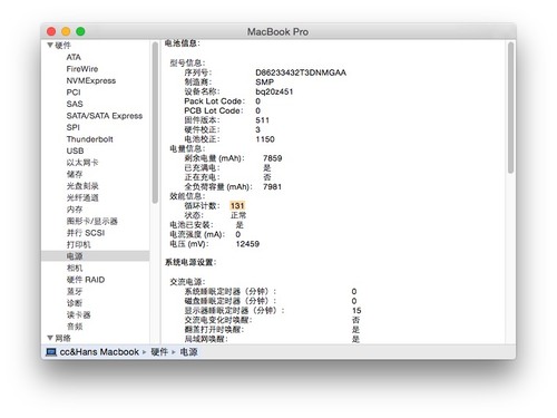 所以电池循环次数往往是二手电脑使用程度的一个重要参考因素, 例如下图中笔者的笔者的MacBook Pro电池已经循环131次,对于一台使用了快两年的笔记本电脑来说,算是比较轻的使用程度了。而电池实际使用容量会随着使用循环次数的增加而逐渐变小, 这也就是为什么电池使用的时间越久,电脑的续航时间越短的原因了。电池实际容量的大小,可以反映电池的健康程度。比如,笔者的笔记本电脑电池健康度为 7859/7981=0.98,也就是98%。